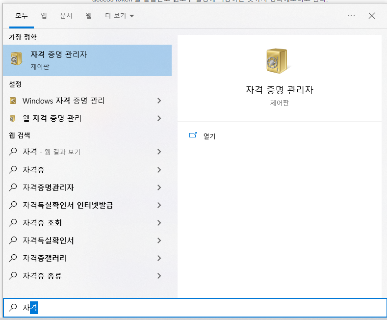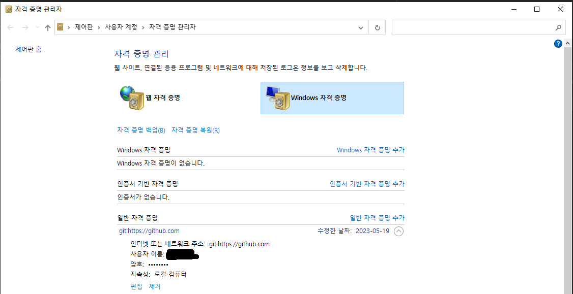 Windows 자격 증명 탭을 선택하면 하단에 일반 자격 증명 목록이 뜬다